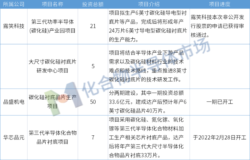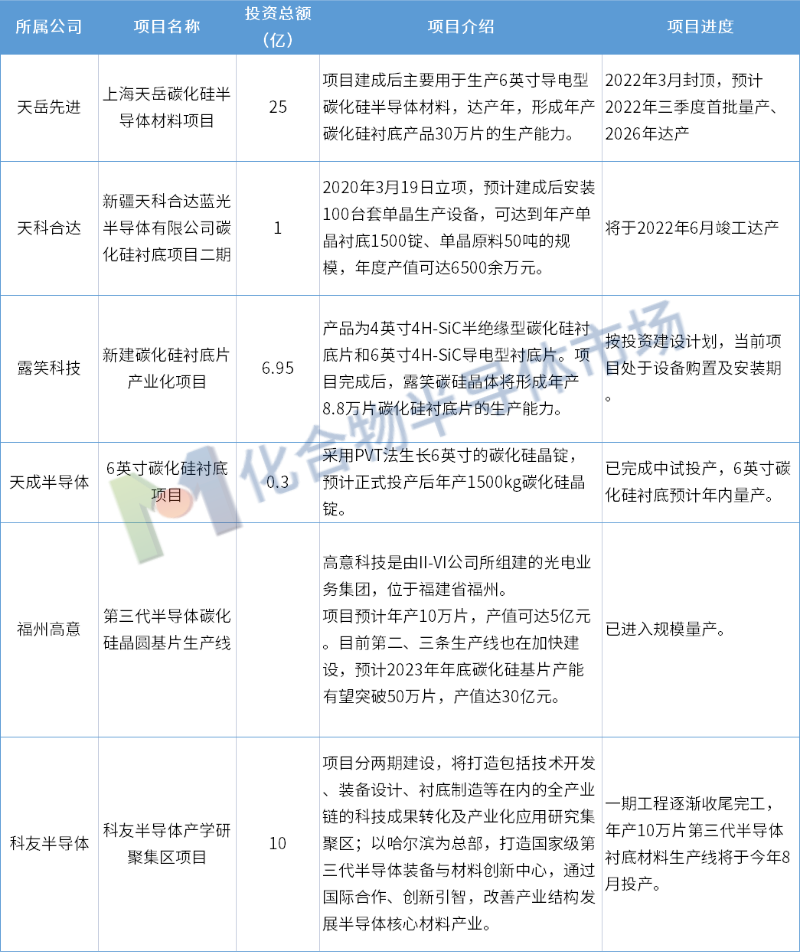 据化合物半导体市场不完全统计,2022年上半年公布新进展的碳化硅衬底项目主要有: